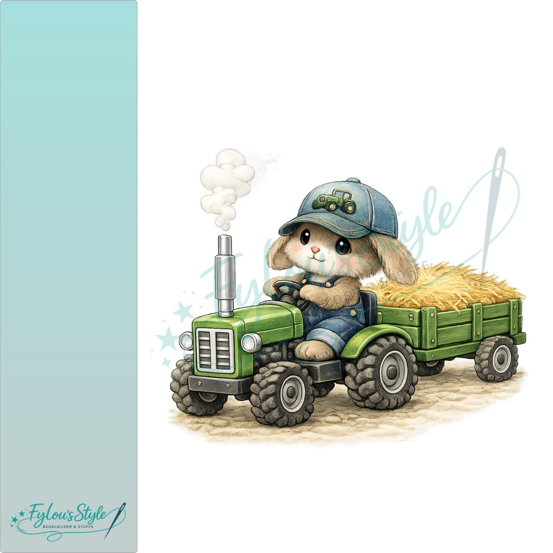 Bügelbild Traktorhase mit Hänger